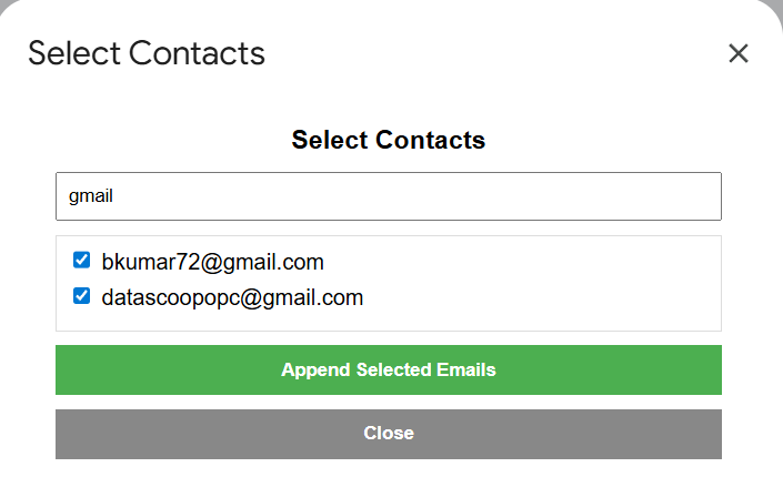 Click on Search Contacts will open a Modal view search box. In this case, I am giving the search string as gmail and you can see two of my gmail contacts appear. Click on the check box and then click on append. It will add to the Email column row which you selected earlier. In our case, it is column C in Sheet 1.