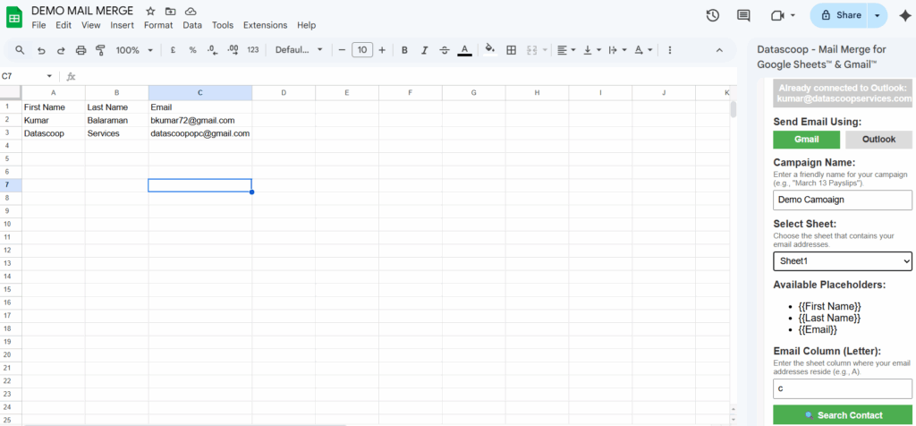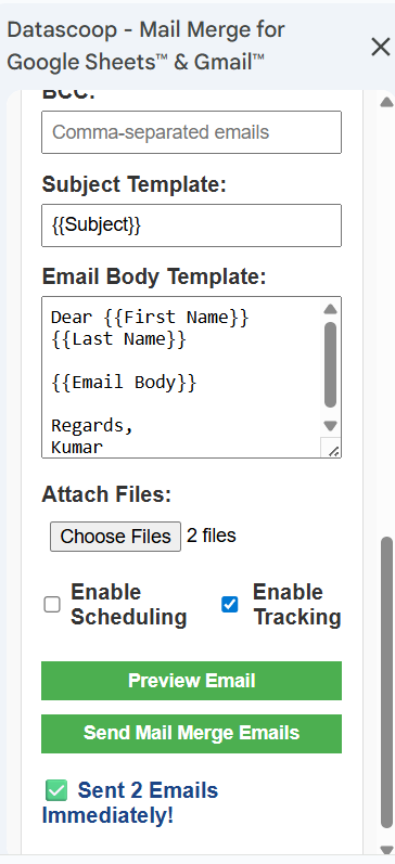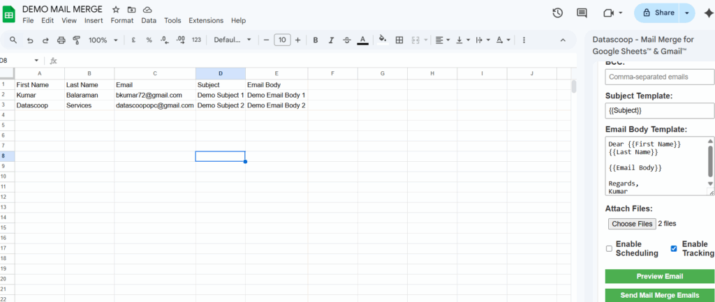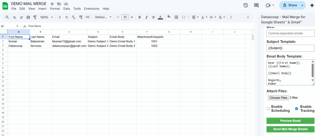 While the above screenshot sends the Same subject and Email body to the recipients, We can also customize the subject and email body by using the Headers in the spreadsheet. This way, you can send customized Subject and Email body unique to each recipients.