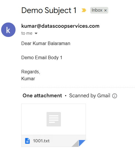 Since we have mapped 1001 to recipient bkumar72@gmail.com, only 1001.txt will go as attachment to bkumar72@gmail.com.