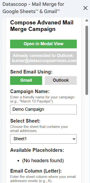 Add Headers to the Spreadsheet, Enter the campaign name, Enter the column name where Email id’s are provided. In my case, it is Column C of Sheet1.